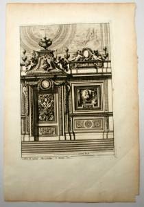 This is a very rare copperplate engraving on hand laid paper by P.J. Mariette after a drawing by Jean Le Pautre. Published in Paris in 1752, these engravings are called landscape/portrait panels and they depicted highly decorative architectural details with cherubs, satyrs, nymphs, etc. as well as scrollwork and acanthus leaves. Jean Le Pautre was born in Paris in 1617 and died in 1682. In the early part of his life he was placed with a carpenter and builder under whom he learned to draw plans and ornamental designs. He afterwards turned his attention to engraving and focused on architectural decorations, friezes, ceilings, vases and other ornaments. He was also one of the principal architects of the French Rococo Movement and like his elder relation, Antoine, his work was much revered by the King of France. He was acclaimed as “the most important and imaginative engraver of the 17th century".