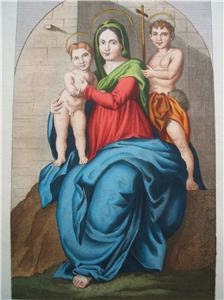 Titled Causae Nostrae, this engraving shows Mary holding the Christ Child while a young, perhaps a saint, boy is at her side. This engraving is from a painting by Andrea del Sarto, an Italian Renaissance painter. Each figure has a halo over their head and the faces have a porcelain quality. The hand coloring is exquisite with rich deep colors. This is a beautiful composition and reminiscent of a stained glass window.