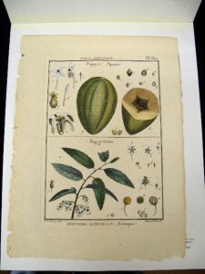 This fine engraving, Pl 821 was drawn by botanical artist, illustrator, J. E. Deseve. Shown are the Papaya and the Kiggelaria, or Wild Peach. This engraving is in good condition with evidence of the original book binding on the left edge and some light spots. There is also a light, diagonal crease from the bottom to the lower right edge. Colors are vivid and the paper is a soft cream. The overall paper size is approximately 9 ½” x 11 ½”. A copy of a sample title page is included.
